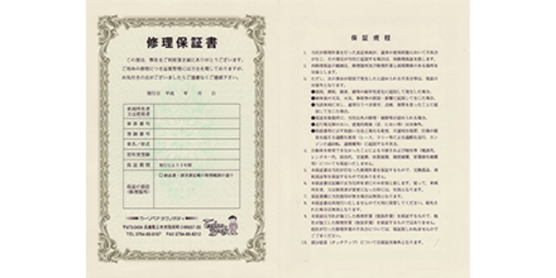実績と経験による、徹底した品質管理により、STEP MOTORSで修理を行った車両には修理箇所の膜厚測定値表と共に新車の塗装保障同等の3年の保証書を発行しております。