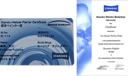 工場設備から熟練度まであらゆる選定基準をクリアし、ハイレベルライセンスであるSTANDOXマイスターBP認定を得ております。高品質な板金・修理・塗装をお届けします。